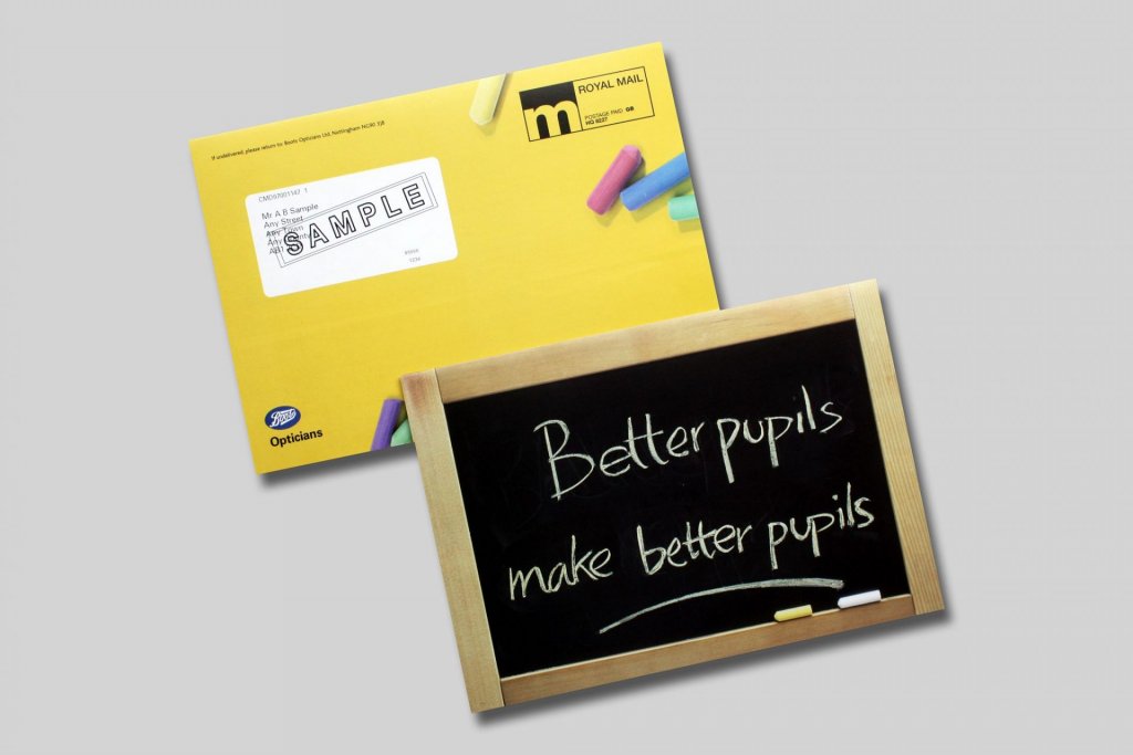 This second Boots Opticians mailer is aimed at parents to persuade them to bring their children in for an eye test.